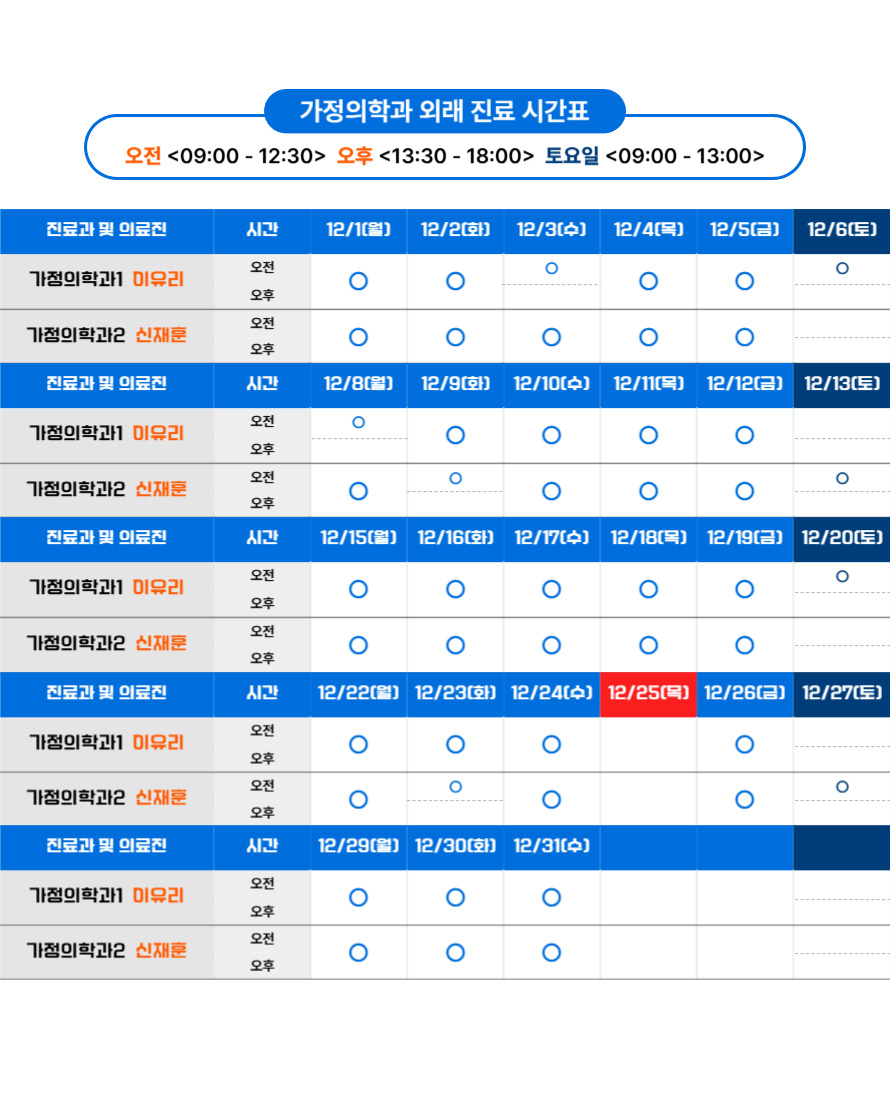 포천우리병원 가정의학과는 일상적인 건강검진부터 만성질환 관리, 예방접종과 건강 상담까지 전 세대를 아우르는 폭넓은 진료를 제공하며, 필요시 각 진료과와 협력하여 환자에게 가장 적합한 치료와 관리 전략을 수립하고 있습니다. 앞으로도 가정의학과는 환자와 가족의 건강한 삶을 지키기 위해 신뢰받는 주치의로서 지역사회와 함께하겠습니다.