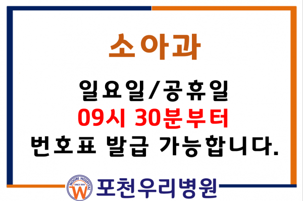 소아과 일요일 및 공휴일 달빛어린이병원 순번대기표 발급시간 변경안내 페이지 정보 작성자 우리병원 작성일26-02-20 14:36 조회83회 전화번호 0315420222 댓글0건 관련링크 이전글 다음글 목록 답변 본문 안녕하세요 포천우리병원입니다.소아과 일요일 및 공휴일 달빛어린이병원 순번대기표 발급시간 변경으로 인하여 공지합니다.변경전 : 09시 변경후 : 09시 30분접수시작시간은 09시 50분 그대로 유지 됩니다. 이전글 다음글 목록 답변