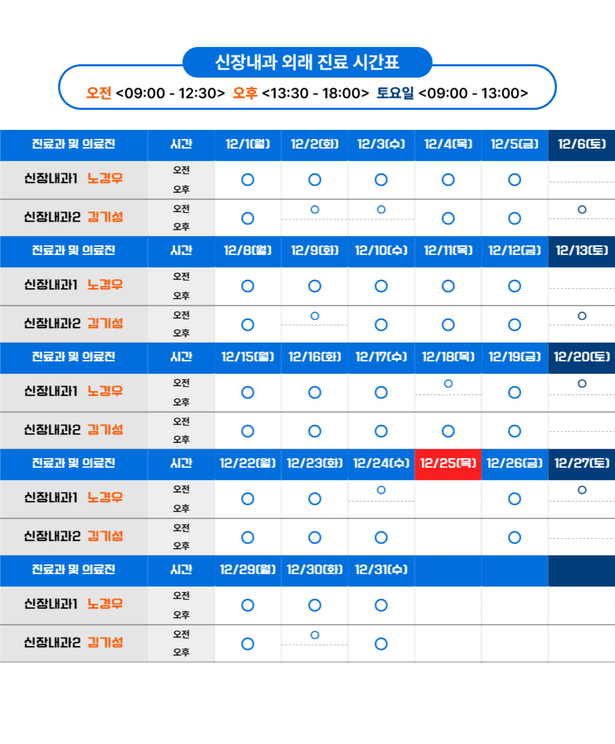 신장 질환은 초기에 뚜렷한 증상이 없는 경우가 많아 방치되기 쉬운 질환입니다. 포천우리병원 신장내과는 전문적인 진단과 맞춤형 치료를 통해 환자의 신장 기능을 최대한 보존하고, 삶의 질을 지킬 수 있도록 최선을 다하고 있습니다.